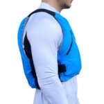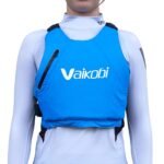 Chaleco VX Race PFD azul de Vaikobi, ajustable de bajo perfil para deportes acuáticos con protección certificada y diseño ergonómico, incluye un bolsillo seguro y es compatible con arneses de cintura.